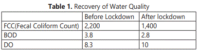 In the previous sections different sources of pollution, water treatment technologies, and different strategies and policies have been discussed and are currently implementing in the pollution control management though they cannot bring any significant change in the system due to the lack of availability of resources, infrastructure and expensive water treatment processes, but the lockdown during the COVID-19 pandemic has brought a significant change which is further discussed in this section. As per the reports of the CPCB during lockdown on the water quality it is shown that quality of water has improved, it could be said that which couldnʼt be achieved from past 34 years through Ganga Action Plan started in 1986 and other government initiatives like nation river programme, has been achieved during the lockdown. It has been noted that cities where there are large companies are allocated like Delhi, Kanpur, Gurgaon there is a drastic positive change in the water quality in terms of DO, BOD and industrial effluents. Close down of industries results in the downfall of industrial effluents and heavy rainfall during the lockdown results in raise of DO and accordingly drop in the BOD. Since spiritual spots like temples and mosque were also closed so the temples and mosques allocated near the rivers has also bring down the solid organic waste, this has resulted in the drop of microbial load and also the BOD. It is well understood that if the flow of the water in the river is enough then the rivers are self-capable to purify them. Dr. Tripathi from Banaras Hindu University has tested some water samples on the Ganga river before and after the lockdown and from the sample test result it illustrates a significant change in the water quality as shown in an article “how lockdown has been a gift for ganga” and can be accessed through this link https://timesofindia.indiatimes.com/india/how-lockdown-has-beena-gift-for-river-ganga/articleshow/75569852.cms. For sampling he has taken samples from 5 locations, i.e as follows Samne ghat, Assi Ghat, Shooltankeshwar, Raj Ghat, Dashashwamedh Ghat. In the Table.1 an arithmetic mean of the sample values has been provided.
