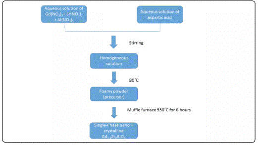 The nanocrystalline Gd1-xSrxAlO3 powder was synthesized by assisted combustion method using high purity of Gd(NO3)3, Sr(NO3)2, Al(NO3)3 and aspartic acid as fuel. All the reagents were purchased from Sigma Aldrich, >99.9%), the required stoichiometric amounts of the starting materials were dissolved in double distilled deionized water in order to obtain a homogeneous solution. This solution was kept at constant heating at 80°C to obtain the foamy powders of Gd1-xSrxAlO3 is show in AS Figure 1. For Calcination, the foamy powder was carried out in a muffle furnace at 550°C for six hours [3-4].
