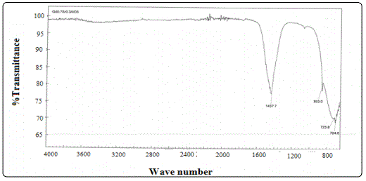 FTIR spectroscopy was used to confirm metal oxide bond formation in the crystal and is investigated their vibrational behavior in solid state of Gd1-xSrxAlO3 powder. It was recorded in the range of 4000 cm-1 to400 cm-1. The infrared spectrums of synthesized samples of Gd0.7Sr0.3AlO3 powder are shown in Figure 5. The broad band at 1437.7cm-1 is assigned to vibration mode of chemically bonded hydroxyl groups. The peak appeared at 853.0 cm-1 corresponds to the H-O-H bond mode confirming the presence of moisture in the sample. The peak appeared at 1437.7 cm-1 is due to the presence of CO2 in the sample. The Gd0.7Sr0.3AlO3 exhibited a low intensity peak at 704.8 cm-1 and the sample exhibited three peaks obtained between the wavelength regions 600-1000 cm-1 which observed at 853.0, 723.8, and 704.8cm-1. The peak appeared at 1437.7 cm-1 is related to the O-H stretching vibration of H2O in the sample. The broad band at 1437.7 cm-1 is assigned to vibration mode of chemically bonded hydroxyl groups.