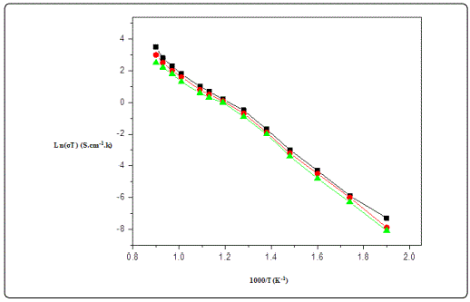 Figure 6. shows that the Arrhenius plots of conductivity for Gd1-xSrxAlO3 samples sintered at different temperature range. It can be seen from Figure 6, that the conductivity of the samples increases gradually with increasing the temperature. In this case, grains grow excessively, and the pores are trapped among the grains or grain boundaries, blocking oxygen ion migration leading to the decreases in the conductivity of the sample. The volatilization of gaseous SrO and O2 from Gd1-xSrxAlO3 at excessively high sintering temperature were detected by mass spectroscopy resulting in the sample volumes bloating and density reduction, so that the conductivity decreases.