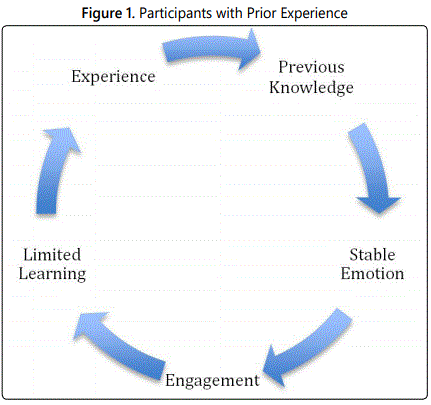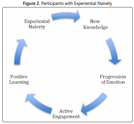 A second illumination from the data came through by recognizing differences existed between participants with prior experience and those having no prior health related training. The cycle of learning for the novice learner resulted in a stronger display of emotion and active engagement making the end result of learning meaningful and rich. The cycle of learning for the experienced participant resulted in similar components but at a lesser intensity of experience with emotion, engagement, and learning outcomes. The theme of experiential naivety promoted sub-themes reflecting a cycle of learning for participants without any prior related training or educational career.