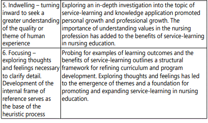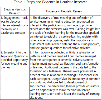The research approach used was heuristic phenomenology described by [26] as a journey that begins with a personal question or challenge and has a significant influence on social or universal aspects. The process began with a personal quest to understand how service learning can be used to facilitate learning. The end result was astonishing and reached far beyond endless opportunities to enhance nursing education. As an educator, this research study provided a starting point for new developments and innovations in nursing education. The data collected is vital and supports reason for improving the quality of learning among students entering the field of nursing.