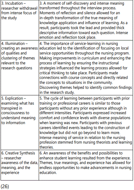 An emphasis on the internal frame of reference, selfsearching, intuition, and indwelling steps of heuristic inquiry made experiencing the connectedness and relationship development with the participants possible. The data collected produced rich and meaningful results. Through a heuristic lens themes illuminated and were recognized as new discoveries in research. The underlying themes may be a consideration for developing frameworks and models in service learning. The themes represented the development and application of knowledge to foster learning. The Creative Synthesis included the knowledge and themes gained from the data collected during the illuminating and explicating steps of heuristic inquiry. The outcomes signified a creative discovery of intuition and tacit understanding.