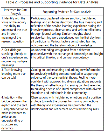 The research questions represented the participants' essences of experiences and focused on knowledge application by focusing on the concept of leadership developed during the service learning experience. An in-depth reflection of how leadership contributes toward the nursing profession provided participants with an opportunity to make connections between theory and experience. The data were specific to each participant's lived experience of service learning and individual perceptions of learning (See Table 2)