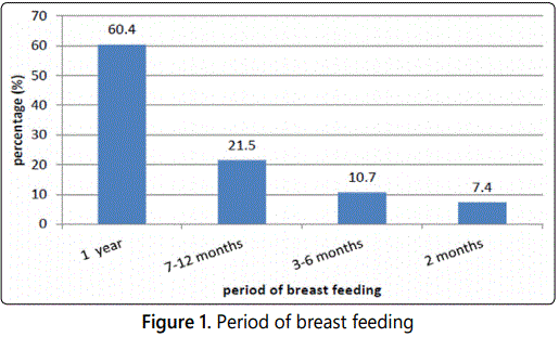 In many developing countries, initiation of breast feeding is delayed by hours if not days, and about 44% of babies in the developing world are now being exclusively breastfed for their first four months [34]. In this study, the period of breast feeding appeared to be continued over one year in the majority of cases (60.4%). This might be attributed to the role of education and the efforts of health care providers in this respect.