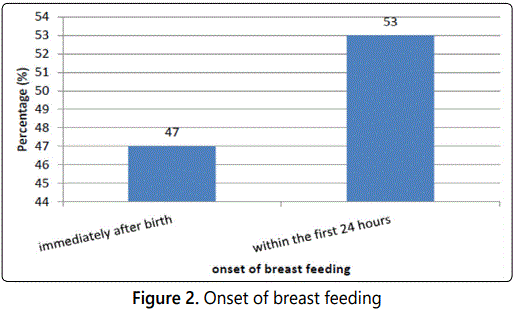 The frequency of breast feeding among the investigated sample was seen to be more than 6 times/day in 61% of cases, 3-5 times/day in 41.3% of cases and only 2 times/day in 24% of cases. The onset of breast feeding, on the other hand, was noticed to be immediately after birth in 47% of babies and during the first 24 hours in the remaining 53% of babies (figure 2).