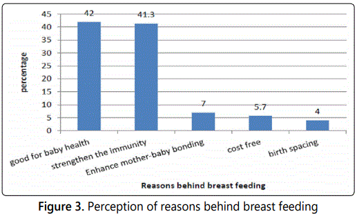 Concerning the perception of the investigated mothers about reasons (benefits) behind the breast feeding, it was found that 42% of the mothers noted that breast feeding is good for the baby's health because it provides the essential nutrients to the babies. 41.3% of the mothers stated that it strengthens the immunity of the babies. 7% of mothers reported it increases infant-mother bonding, cost free (5.7%) and birth spacing (4%) as appeared in figure 3.
