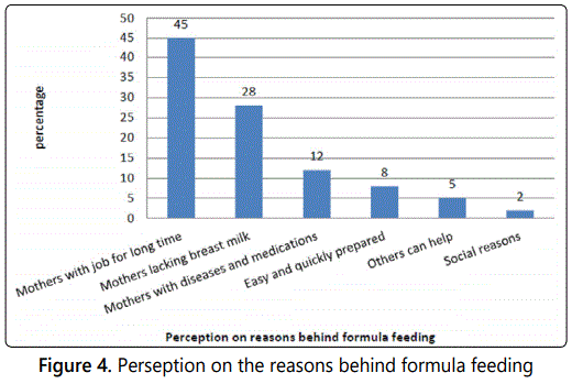 Regarding the perception of mothers about reasons behind formula feeding, the highest percentage of mothers (45%) reported that formula feeding is suitable for mothers who are employed. Good choice for mothers who lack breast milk (28%), good for mothers with diseases and medications (12%), easy and can be quickly prepared (8%), and others can help (5%). Very few cases (2%), however, preferred formula feeding for social reasons (figure 4).