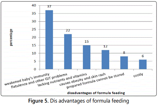 In regard to disadvantages of formula feeding, 37% of cases reported it weakened baby's immunity. 22% of cases noted it causes flatulence and other gastrointestinal problems and in 15% no adequate nutrients and vitamins are provided. In others (12%), it causes obesity and skin rash. Some women (8%) reported that they cannot keep the milk for long period of time and 6% of cases reported it is costly (figure 5).