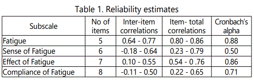 The maximum of inter-item and item-total correlations was higher for the fatigue subscale and lower for the sense of fatigue subscale. Reliability estimates as measured by Cronbach's alpha for the four subscales ranged from 0.50 to 0.88.