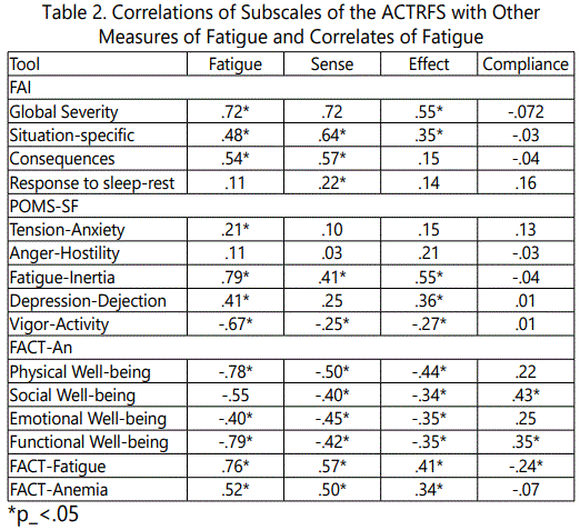 Convergent validity was appraised by testing a series of hypotheses about the direction and strength of correlation between the subscales of the ACTRFS and selected subscales of the Fatigue Assessment Instrument, Profile of Mood StatesShortened Form and the Functional Assessment of Cancer Therapy-An. Table 2 reveals these findings.