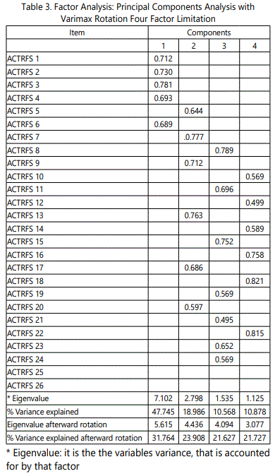 The construct validity of the ACTRFS was appraised using a factor analysis with a Varimax rotation. Support for a four-factor solution was found for the 26-item ACTRFS. Item loadings on the factors are exposed in Table 3. Twenty-four items with factor loadings greater than (0 .40) were retained for further analysis. Two items did not load on any of the four factors. Five items loaded on Factor 1; 6 items loaded on Factor 2; 7 items loaded on Factor 3; and 6 items loaded on Factor 4.