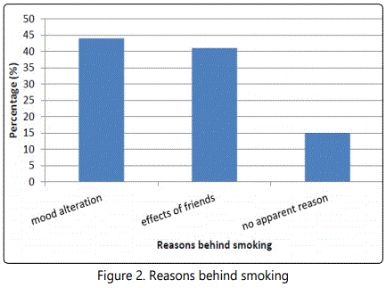 The reason behind smoking was reported to be due to mood alteration (44%) and effects of friends (41%). Less commonly (15%) smoking reported to be without any apparent reason (Figure.2).