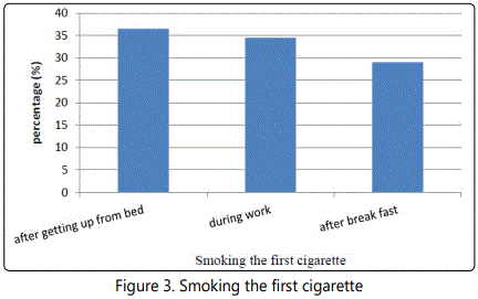 Smoking the first cigarette was found to be after getting up from bed in the morning in 36.5% of cases, whereas it was practiced during work in 34.5% of smokers. However, 29% of smokers started their first cigarette after breakfast (Figure.3).