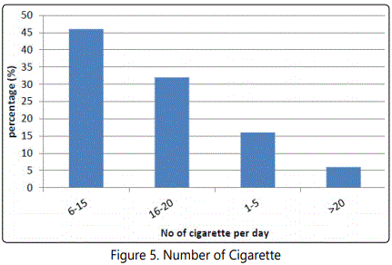 About 46% of participants were found to smoke 6-15 cig. /day, 32% smoke about 16-20 cigarette daily, 16 % found to smoke 1-5 cig. /day and only 6% were found to smoke more than 20 cigarettes daily as appeared in figure. 5.