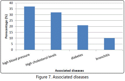 In regards to the symptoms or complaints that are associated with the smoking, about 54% of smokers stated that they are suffering from cough, 26% suffering from teeth discoloration and bad smell in the mouth while the remaining 20% reported that they are suffering from loss of appetite. Relative to the associated or pre existing diseases reported by the smokers, it was found that about 37% have high blood pressure, 32% of the have high cholesterol level, 21% have diabetes, and 10% of the smokers already suffer from bronchitis (Figures. 6 & 7).
