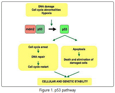 It is very important for cells in multi cellular organisms to suppress cancer [12]. P53 has been described as “the guardian of the genome”, referring to its role in conserving stability by preventing genome mutation. The p53 tumor suppressor plays a key role in organizing cellular responses to various types of stresses, including DNA damage and oncogene activation with apoptosis, cell cycle arrest or DNA repair as shown in Figure (1) [13]. Malfunction and mutations of p53have been found in most of human cancers, leading to deregulated p53 activity that allows proliferating and surviving unchecked Figure (2)[14].