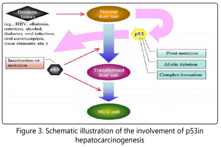 The development of HCC is a multi-stage process and closely related to viral infection and chemical carcinogens. In the molecular aspect, dysregulation of growth factors, receptors and their downstream signaling pathway components represents a central pro-tumorigenic principle in human hepatocarcinogenesis [15]. p53 is one of the tumor relevant factors. Alteration of p53 status is an important intrinsic factor in this process. Its inactivation by point mutations within its gene or allelic deletions as well as the complex formation of wild (wt) p53 with several extrinsic factors, such as aflatoxin, HBV, nutrition, alcohol, and trace elements, are thought to initiate or/and promote the hepatocarcinogenesis, Figure 3 [16].