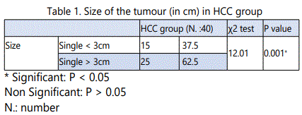 In HCC patients with tumour size<3cm, the mean value of serum AFP was 145.85 ± 73.87, while in HCC patients with tumoursize> 3cm, its mean valuewas541.76±175.8. In HCC patients, with tumor size <3 cm, 2/15 patients (5 %) showed p53 (G→T) gene mutation, while in HCC patients with tumor size >3 cm, 10/25 patients (25 %) showed p53 (G→T) gene mutation. There were a statistically significant increase in the mean values of serum AFP as well as in the pecentage of P53 (G → T) gene mutation in HCC patients with the tumour size > 3cm when compared to patients with the tumour size< 3cm (p<0.05).