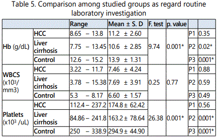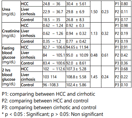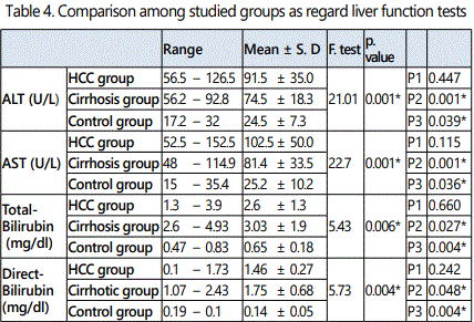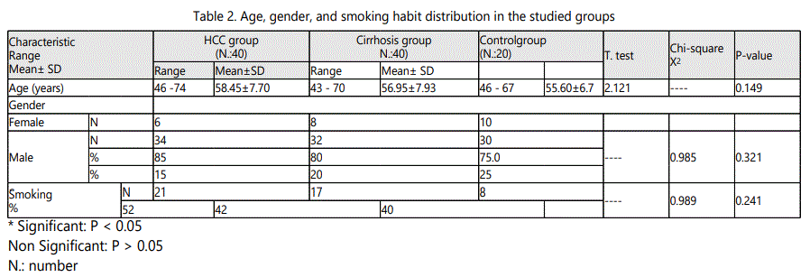 In HCC group the age ranged from 46 to 74 years with a mean value of 58.45 ± 7.70, in cirrhosis group it ranged from 43 to 70 year with a mean value of 56.95 ± 7.93, while in control group it ranged from 46 to 67 year with a mean value of 55.60 ± 6.7.As regard sex, in HCC group, male patients were 34 (85 %) and females patients were 6 (15.0%), in cirrhosis group they were 32 (80 %) males and 8 (20.0%) females, while in control group they were 30 (75.0 %) males and 10 (25.0%) females. It was proved no significant difference in both age and sex among all studied groups (p > 0.05).