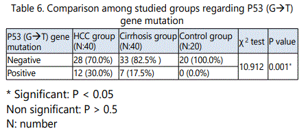 As regard p53G→T gene mutation, 12/40 (30.0%), 7/40 (17.5%) and 0/20 (0.0%) were positive in HCC, cirrhosis and control groups respectively. In HCC group, 28 (70%)were wild type (GG),8 (66.7%)were heterozygous (GT), while 4 (33.3%) were homozygous (TT). In cirrhosis group33 (82.5)were wild type (GG), 6 (85.7%)were heterozygous (GT) and1 (14.3)was homozygous (TT).