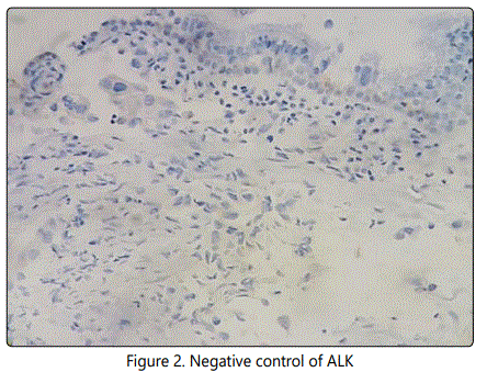 Immunohistochemistry: Immunohistochemistry for ALK and EGFR was performed on formalin fixed paraffin embedded (FFPE) tissue blocks containing primary tumour and Immunohistochemical staining was carried out using Ventana Benchmark XT autoimmuno stainer (Ventana, USA). In this study ALK expression (clone D5F3, Ready to Use, Ventana) was carried out using OptiView DAB detection kit and EGFR (clone EP38Y, Ready to use, Ventana), CK-7, TTF-1 and CEA was carried out using UV DAB detection kit according to manufacturer's protocol. Appendix was used as positive control for ALK (Figure-1) and figure-2 shows negative staining pattern of ALK.