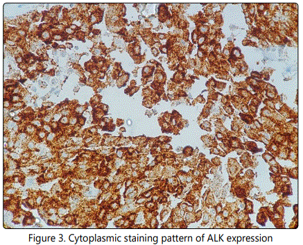 In 101 lung adenocarcinoma patients, cytoplasmic staining of ALK expression was observed in 11% patients (11/101) (Figure-3).