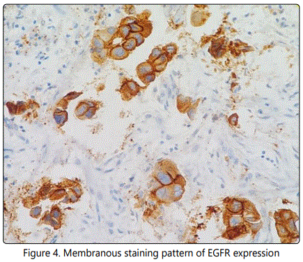 EGFR expression was evaluated in 50 patients. Membranous staining of EGFR expression was noted in 72% (36/50) of patients (Figure-4).