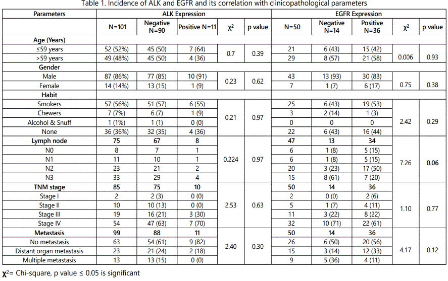 Results: In this study 11% patients showed ALK fusion protein expression. In relation to clinical parameters, a higher positive expression was observed in patients with age <59, in male gender and tobacco users. Further, with pathological parameters a higher expression of ALK was observed in advanced stage and positive lymph node status. EGFR expression was noted in 72% patients. In relation to clinical parameters, higher EGFR expression was seen in patients with age >59 years, in male gender with tobacco habit. Further, with pathological parameters, a trend of higher EGFR expression was observed in patients with positive lymph node status (p=0.06). In this study 8% of patients had ALK and EGFR dual expression, which is uncommon.