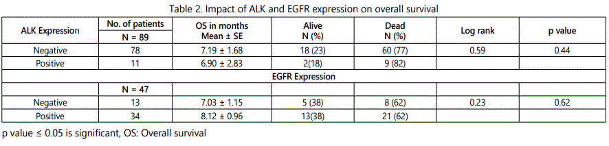 According to Kaplan Meier, univariate survival analysis, no significant difference in overall survival was noted between ALK negative patients (23%, 18/78; 7.19 ± 1.68 months) and ALK positive patients (18%, 2/11; 6.90 ± 2.83; Log rank=0.59, df=1, p=0.44) (Table-2).