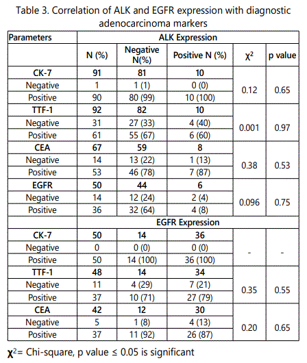 Correlation of ALK and EGFR with diagnostic adenocarcinoma markers (CK-7, CEA, TTF-1)