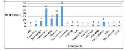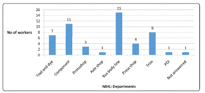 A cross sectional descriptive study was carried out in December 2011 in an automobile manufacturing unit in Karachi, Pakistan. Written consent was obtained from Chief Executive Officer of the company. Verbal consent was taken from subjects who were workers in different departments. The study consisted of noise monitoring, questionnaire, otoscopic examination, audiometry of the workers and health/safety survey. We used random method of sampling. 272 workers participated in questionnaire study. 206 workers i.e.76% of the sample underwent audiometry.