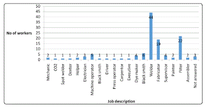 The noise survey was carried out by a trained health and safety coordinator with a sound level meter TES 1351 made in Taiwan. Calibration was done by the instrument department of the company. Noise level meter was placed at shoulder level of the worker. Nine readings were measured at three different times on the same day. The minimum and maximum were noted and average of 9 readings was calculated.