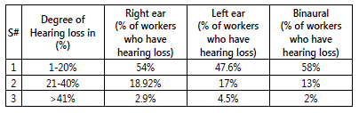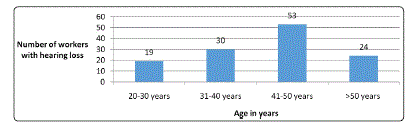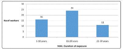[33] found that as duration of exposure increases hearing loss increases. We found in our study that workers suffering from noise related hearing loss 47% had exposure of 11-20 years,