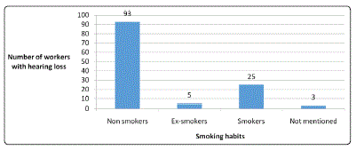Mohammadi S et al. [52] found in their study that there was increased frequency of hearing loss in smokers as compared to non-smokers who were exposed to excessive noise. Their findings is different from our finding it could be due to selection bias or deliberately hiding of smoking by the workers due to fear of losing their jobs.