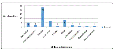 No statistically significant difference was noted between job duration and NIHL/non-NIHL subjects (p=0.39). Therefore duration of job has no statistically significant relationship with NIHL.