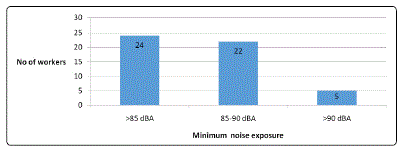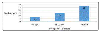 We found that maximum number of workers suffering from NIHL had exposure of more than 90 dBA. This confirms that NIHL is related with severity of noise. Osibogun A et al.
