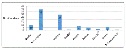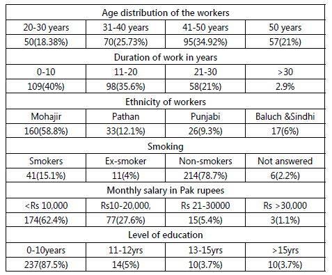 58.8% belong to Mohajir ethnic group, 19.1% were smoker/ex-smokers, 62% earned less than Rs 10,000/month, 87.5% received education for 0-10 years and 40% had work experience of 0-10 years. The majority of the workers were exposed to noise level higher than the safe limit of 85 dBA.