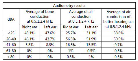 Monaural and binaural hearing impairment: Monaural and binaural hearing impairment is expressed in terms of % by using threshold average of frequencies 1, 2, 3 and 4kHz.