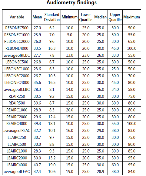 1. From the audiometric results, the average of thresholds of hearing for frequencies of 1, 2, 3 and 4kHz was calculated.