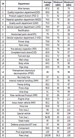 Table 2: Noise survey : Noise levels (dBA) in different departments of the work place.
