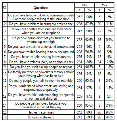 accepted that when they talked to different people it seems to them that they are mumbling. We found "trouble in hearing in noisy background" as most common symptoms among those suffering from noise related hearing loss (17.64%). This shows that a questionnaire study will give low prevalence rate of NIHL in our setting. The findings of our study has been verified by M. Rosso, R. Agius, N. Calleja, mentioned that a questionnaire for early detection of NIHL was having a 32%