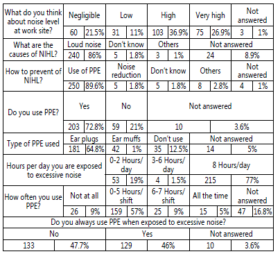 Summary of the result is as follows. 26.9% of workers consider that noise level at work site is very high. 86% know that loud noise causes NIHL. 89.6% consider that NIHL can be prevented by using PPE. 72.8% were using PPE. 46% were always using PPE when exposed to excessive noise (Table 4).