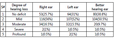 Table 5: Hearing deficit in right and left ear and better hearing ear.