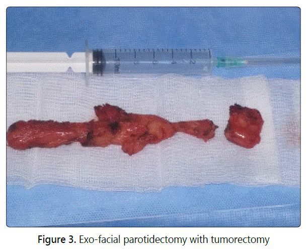 A healthy 16-year-old girl was referred for evaluation and management of progressive, unsightly swelling of the right cheek. The swelling had been present since 2-years and had gradually increased in size. No prior history of trauma, dental problems, trismus or other medical problems was noted. Clinical examination showed a big swelling in the right cheek, measuring 9 cm x 4 cm, painless, well circumscribed, and firm (Fig 1). The overlying skin was freely moveable and not discolored. No pulsation or collateral venous circulations were noted. There was no lymphadenopathy. The patient was otherwise asymptomatic. Facial CT Scan with contrast injection revealed a high-density region in the right masseteric muscle measuring 31 x 47 x 83 mm without bonelysis. MRI showed voluminous encapsulated tissue mass in isosignal T1 and T2 in the right masseter muscle (Fig 2). The arteriography showed a vascularised mass by a branch of the maxillary artery. Preoperative diagnosis was hemangioma of the masseter muscle and surgery was scheduled after arterialembolization. The patient was operated externally by performing an exo-facial parotidectomy with tumorectomy by taking a little part of the masseter muscle (Fig 3). The operative sequences were simple, with facial paresis.