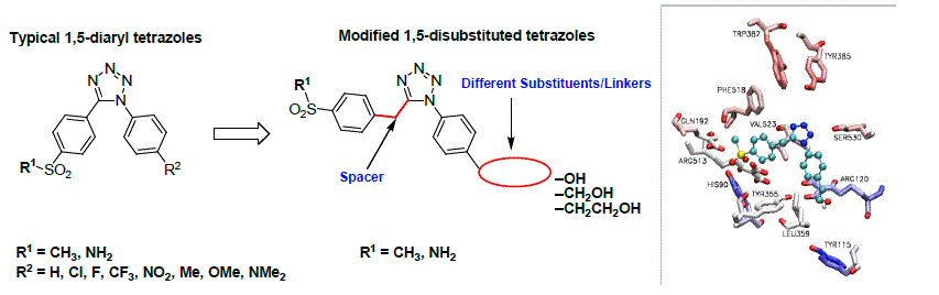 Throughout five years of research, we reported 29 examples of novel 1,5-diaryl tetrazole derivatives (typical azoles) as cyclooxygenase-2 (COX-2) inhibitors. We investigated two modes of connectivity in regards to the pharmacophore unit position and type. The inhibitory potency of the typical active azoles ranged between 1.2->100 µM toward COX-2 enzyme. The molecular docking studies of the most potent candidates showed that they are well seated inside the active site of both enzymes COX-1 and COX-2. Our recent structure-activity relationship study of a novel set of 1,5-disubstituted tetrazoles, together with the molecular docking results, proved the importance of the introduced structural modifications of the typical azoles. These modifications included using linkers with different lengths at one of the phenyl group (OH, CH2OH, CH2CH2OH) and inserting a methylene (CH2) unit between the central motif and the other phenyl group which holds the pharmacophore unit. Our bioassay screening data showed that the azole which has the CH2 spacer, the longest linker (ethyl alcohol), and the methylsulfonyl (CH3SO2) unit has the best inhibition potency for both enzymes IC50: COX-1 = > 200 µM, COX-2 = 3 µM. Further, the molecular docking studies illustrated that this azole, our lead compound, is well seated and capable of forming strong hydrogen bonds with certain amino acid residues inside the active site of the COX-2 enzyme. In the case of the COX-1 enzyme, however, the pharmacophore unit is drafted away from the active site resulting in extremely weak or no inhibition for the house keeping enzyme COX-1.