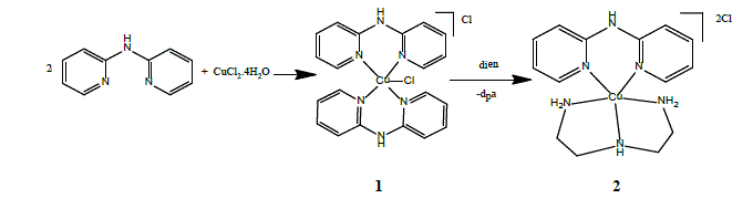 New water soluble mono-cationic [Cu(dpa)2Cl]Cl and dicationic ligands mixed [Cu(dpa)(dien)]Cl2[dpa = 2,2-Dipyridylamine and dien= diethylenetriamine], were made available as Schemed. The desired complexes structure were spectral and XRD characterized. Single-crystal X-ray diffraction for [Cu(dpa)2Cl]Cl showed a distorted square pyramidal geometry around Cu(II) center. The desiredcomplexes revealed promising CT-DNA and antitumor activity against several types of cancer cells.