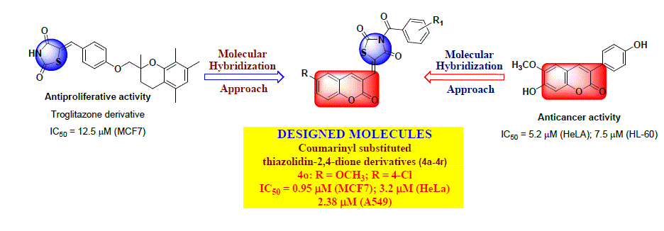 In this research work, a series of eighteen novel coumarinyl substituted thiazolidin-2,4-dione analogs (4a-4r) have been designed by molecular hybridization approach, synthesized and their structures were established on the basis of FTIR, 1H NMR, 13C NMR and elemental (CHN) analysis. These title compounds were screened for their cytotoxicity using MTT assay methodology against five different mammalian cancer cell lines viz. hormone dependant breast adenocarcinoma (MCF7), cervical carcinoma (HeLa), colorectal carcinoma (HT29), lung cancer (A549), prostate adeno carcinoma (PC3). The cytotoxicity screening studies revealed that MCF-7, HeLa and A549 cancer cell lines were sensitive to all the tested compounds. Though the compounds showed varying degrees of cytotoxicity in the tested cell lines, most significant effect was observed for compounds 4i (1.06, 2.4 and 3.06 µM) and 4o (0.95, 3.2 and 2.38 µM) against MCF7, HeLa and A549 cell lines respectively. In conclusion, the anticancer results of these promising leads strongly encouraged us for additional lead optimization with the aim of developing more potential anticancer agents.