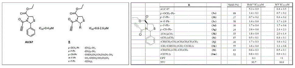 Cancer results from unregulated cell growth. Reactivating cell death in cancer cells, i.e. apoptosis, is a classical anticancer therapeutic strategy. Theapoptosis-inducerproperty of the (2RS,4R)-2-phenyl-3-propinoyl-thiazolidine-4-carboxylic acidethyl ester (ALC67) molecule has been discovered recently1,2. Toelucidate the mechanism of action of this molecule and to evaluate the impact of the phenyl group that the thiazolidine ring presents at its second position on thecytotoxicity, we developed derivatives ALC 67 analogues replacing the phenylmoiety with various aliphatic and aromatic groups.