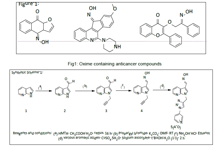 Azaindoles and 1,2,3-triazoles are imperative class of heterocyclics and play a major role in medicinal chemistry. Several of these were found to have anti-cancer and anti-angiogenic properties. Several pharmacophores like naphthofuranones, methoxyphenyl oximes, and piperazinylindenoquinolinone having oxime (hydroxylamino) as a functional group display very good anticancer activity (Fig 1). A series of novel 1, 2, 3-triazole derivatives of 7-azaindole (5A-O) were synthesized (Scheme 1) and screened for their in vitro cytotoxicityagainst MDA MB-231(breast), A549(Lung) and HeLa(cervical) cancer cell lines, by sulforhodamine B assay method. All the synthesized compounds exhibited antiproliferative activity with GI50 values ranging from 0.12 to 9.84 µM. It is observed that, majority of the compounds displayed significant growth inhibition on A549 and MDA MB 231 cancer cell lines as compared to HeLa cancer cell line. Compounds 5d and 5k showed potent activity against A549 with GI50 values 0.12 µMand 0.16 µM while the positive controls, doxorubicin and paclitaxel demonstrated the GI50 in the range of 0.01-0.09 µM and < 0.01-0.023 µM respectively. These derivatives were also subjected to molecular docking study to investigate the mode of binding by using ALK (Human anaplastic lymphoma kinase) enzyme using Schrodinger suite 2013.